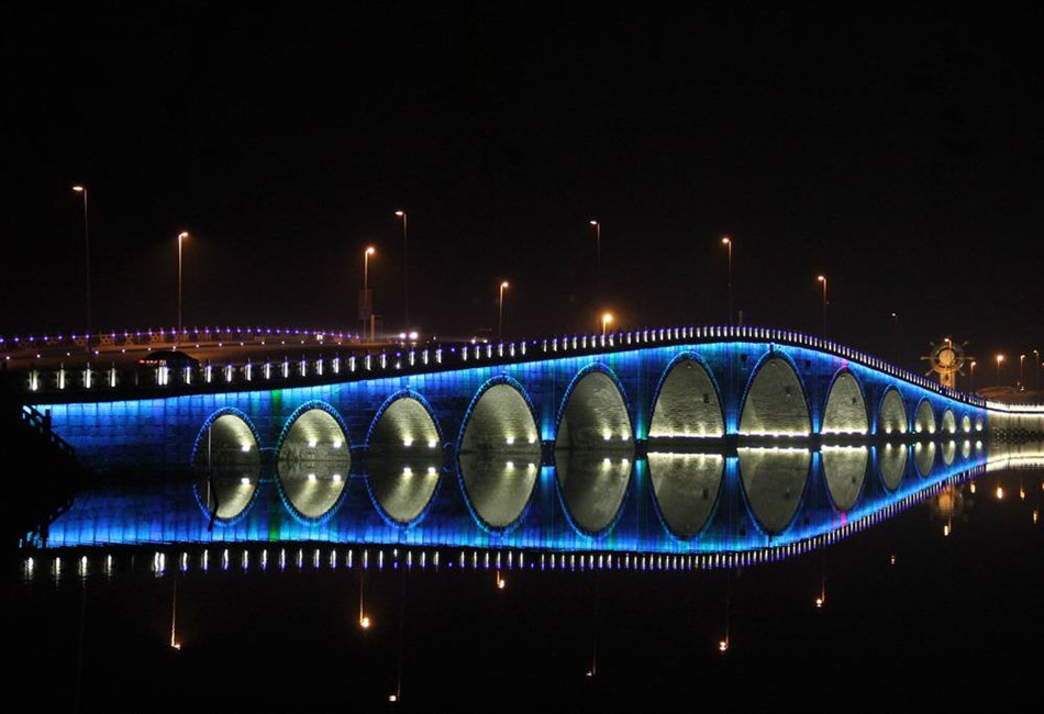 项目临近城市主干道渤海十八路的建筑沿街面是本次照明设计重点表达的对象。