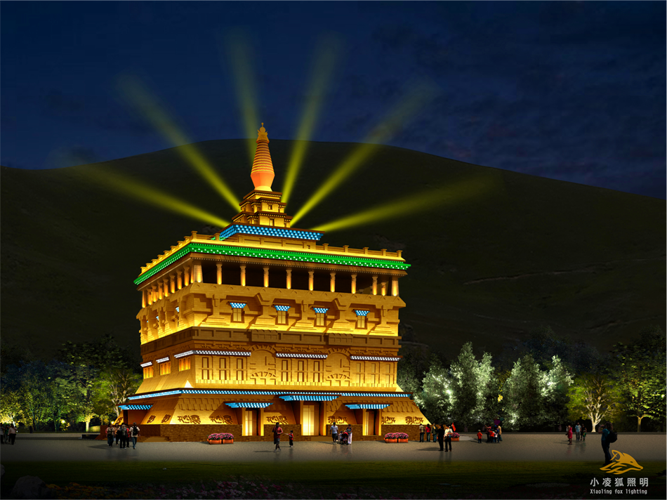塔身部分整体以金黄色打光,楼体建筑代表藏族文化的“巴氏躲躲”标志部分用白色洗墙灯把整体打亮,塔顶用金黄色的投光灯把整体形状打亮, “黄色”代表鲜明的个性,给人轻松愉快,充满希望和活力的感觉。