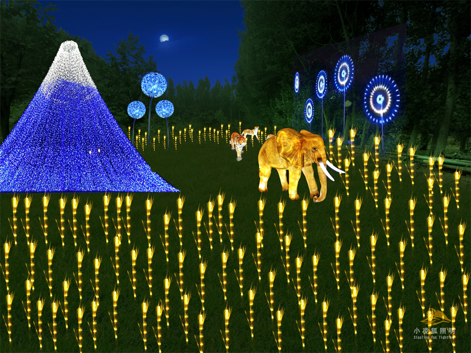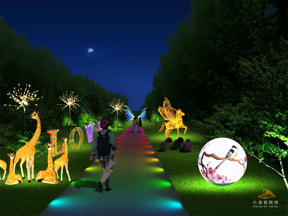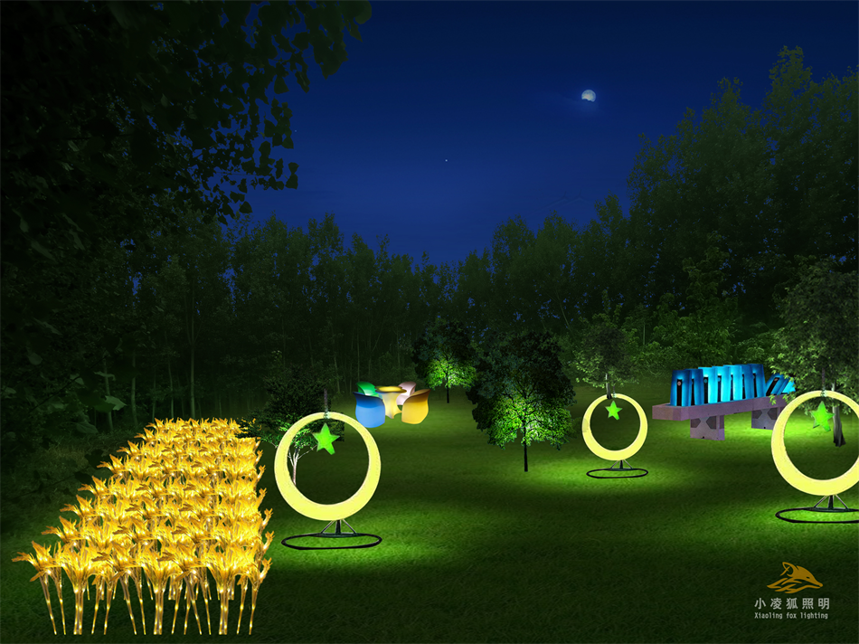 公园亮化设计应通过灯光的分层重点布局,利用投射、强调、映衬、明暗对比等手法来强调柔化空间场所产生的效果,注意眩光的严格控制应用点与面的结合,达到照明有序,柔和舒适场景,将公园景观的层次感、高低空间感诠释出来。