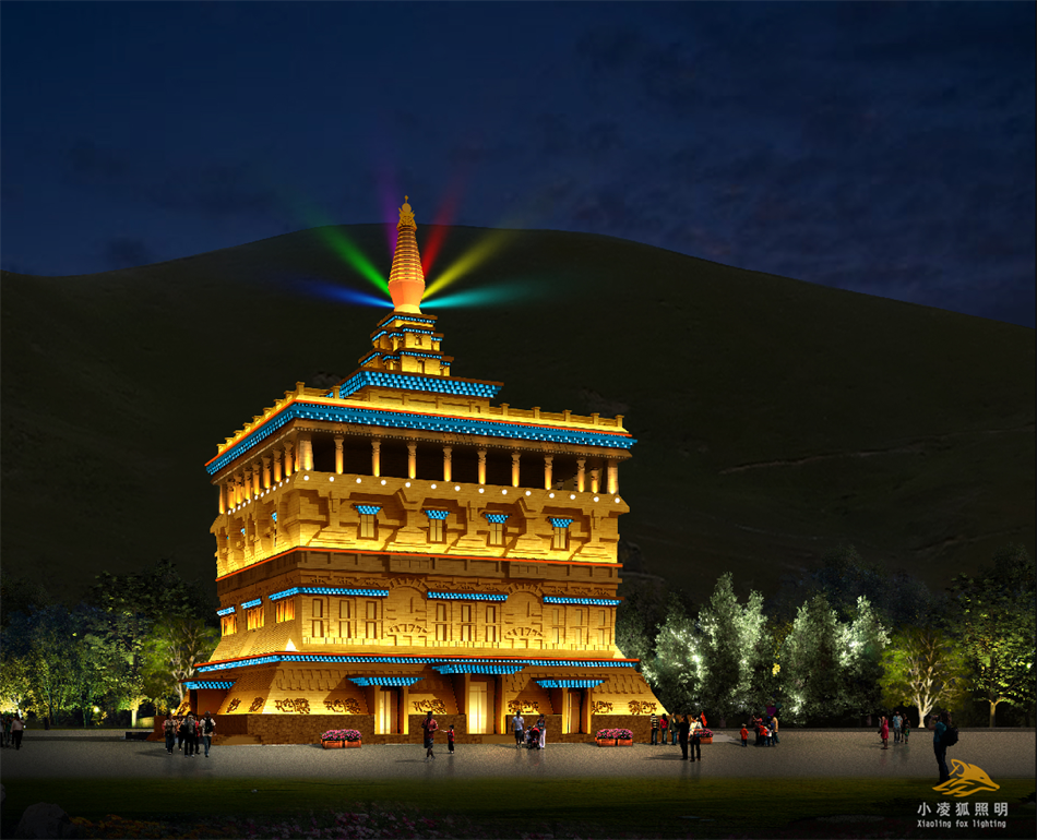 塔身部分整体以金黄色打光,楼体建筑代表藏族文化的“巴氏躲躲”标志部分用白色洗墙灯把整体打亮,塔顶用金黄色的投光灯把整体形状打亮, “黄色”代表鲜明的个性,给人轻松愉快,充满希望和活力的感觉。
