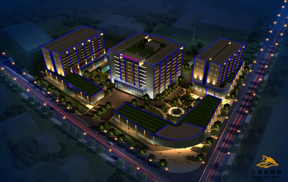 医院建筑外观照明重点是在强调医院建筑形象和周边环境和谐共生二者之间做到平衡。对此常采用建筑顶部泛光照明的方法,突出医院建筑,投射出一种安全、高效、舒适的医院建筑形象。同时,结合建筑物表面材料选择光源及灯具,合理布灯,避免光污染,使之融入靓丽、温暖的城市夜景照明。